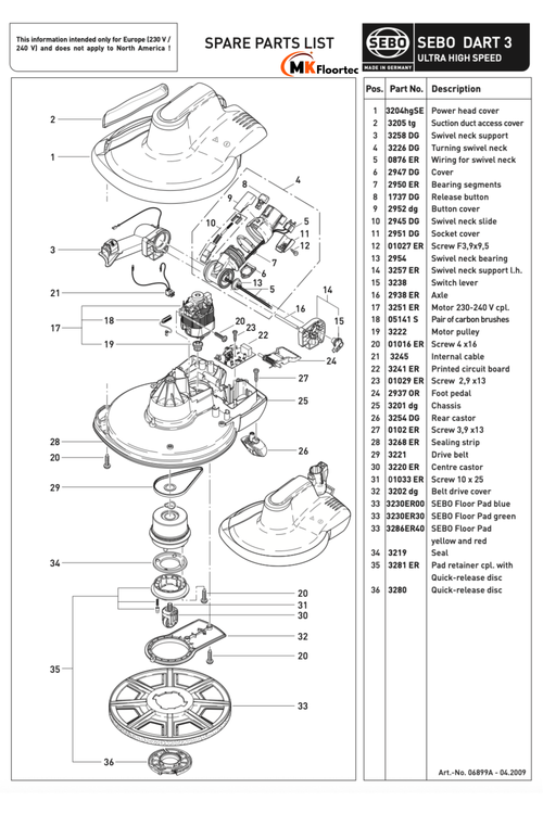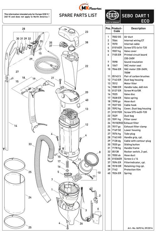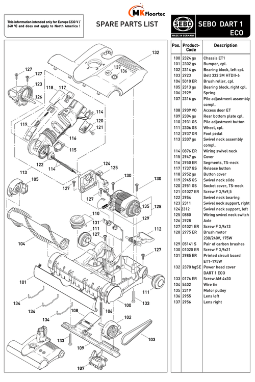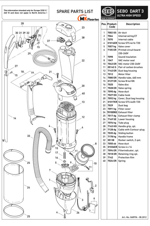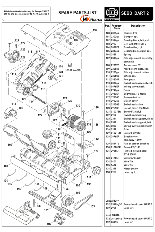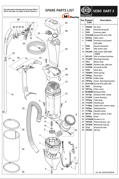 Sebo Dart 1, Dart 2 and Dart 3 Vacuum Spares and Parts