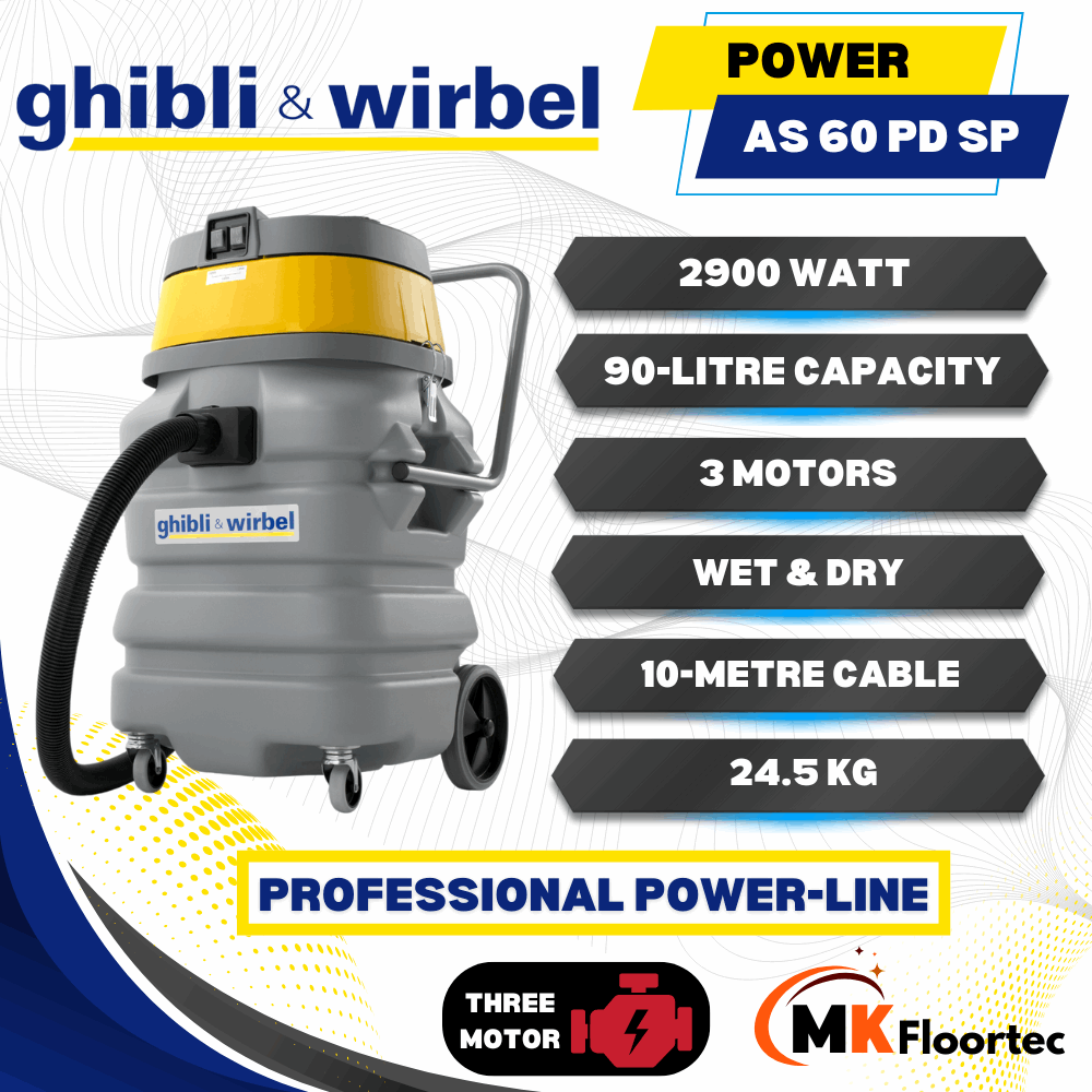 The Ghibli Industrial Wet and Dry Vacuum Cleaner AS 60 PD SP is a large robust and high-performance industrial wet and dry vacuum cleaner powered by three motors and featuring a substantial 90-litre SHOCK-PROOF wet container. Equipped with three professional-grade motors, it delivers a total of 2900 Watts, allowing you to use them separately or in combination based on the cleaning power needed. An integrated drain dump hose makes the emptying process hassle-free. Designed to tackle wet or dry debris, water, or sludge, Ghibli & Wirbel's vacuum cleaners are perfect for extensive areas and demanding cleaning tasks. A high quality solution for car valeting and detailing services.