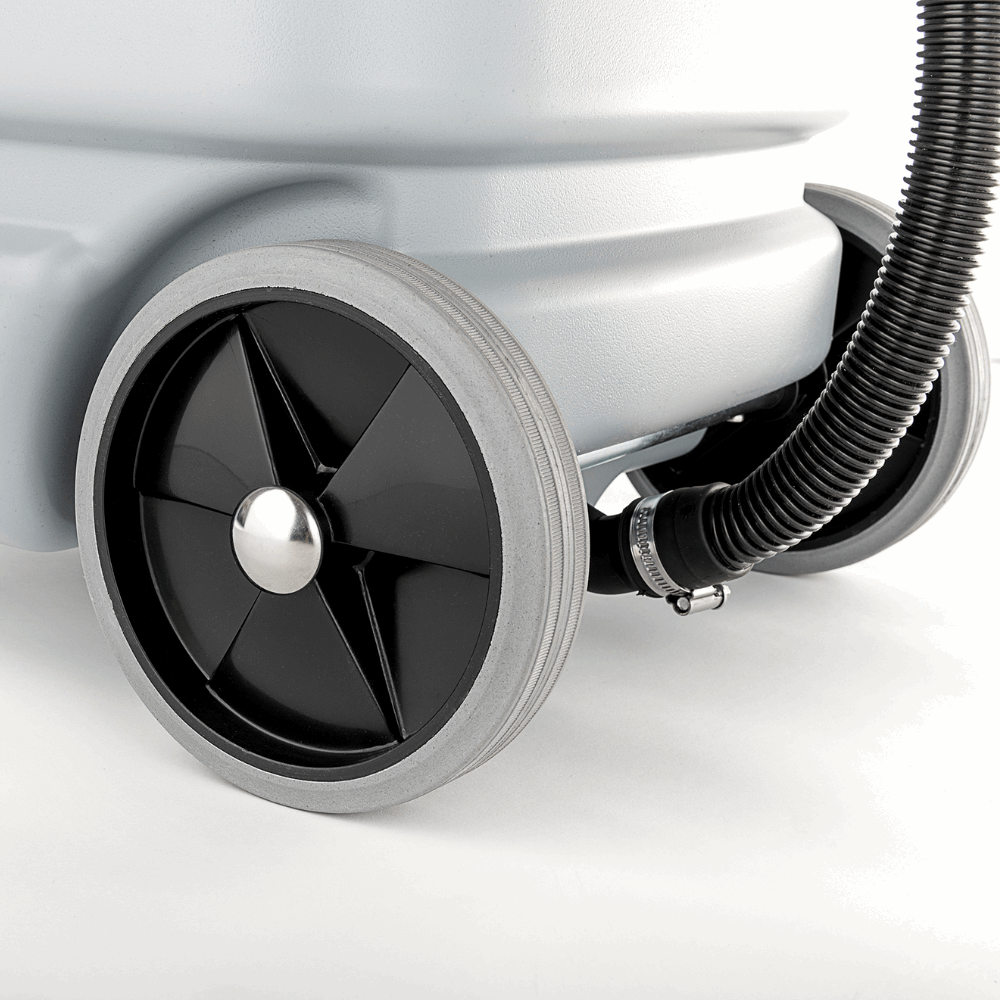 Built from resilient materials, the AS 60 PD SP features an impact-resistant polypropylene tank, making it well-suited for rigorous cleaning demands. It is designed with large rear wheels, front swivel castors, and a push-pull tipping handle for enhanced manoeuvrability.