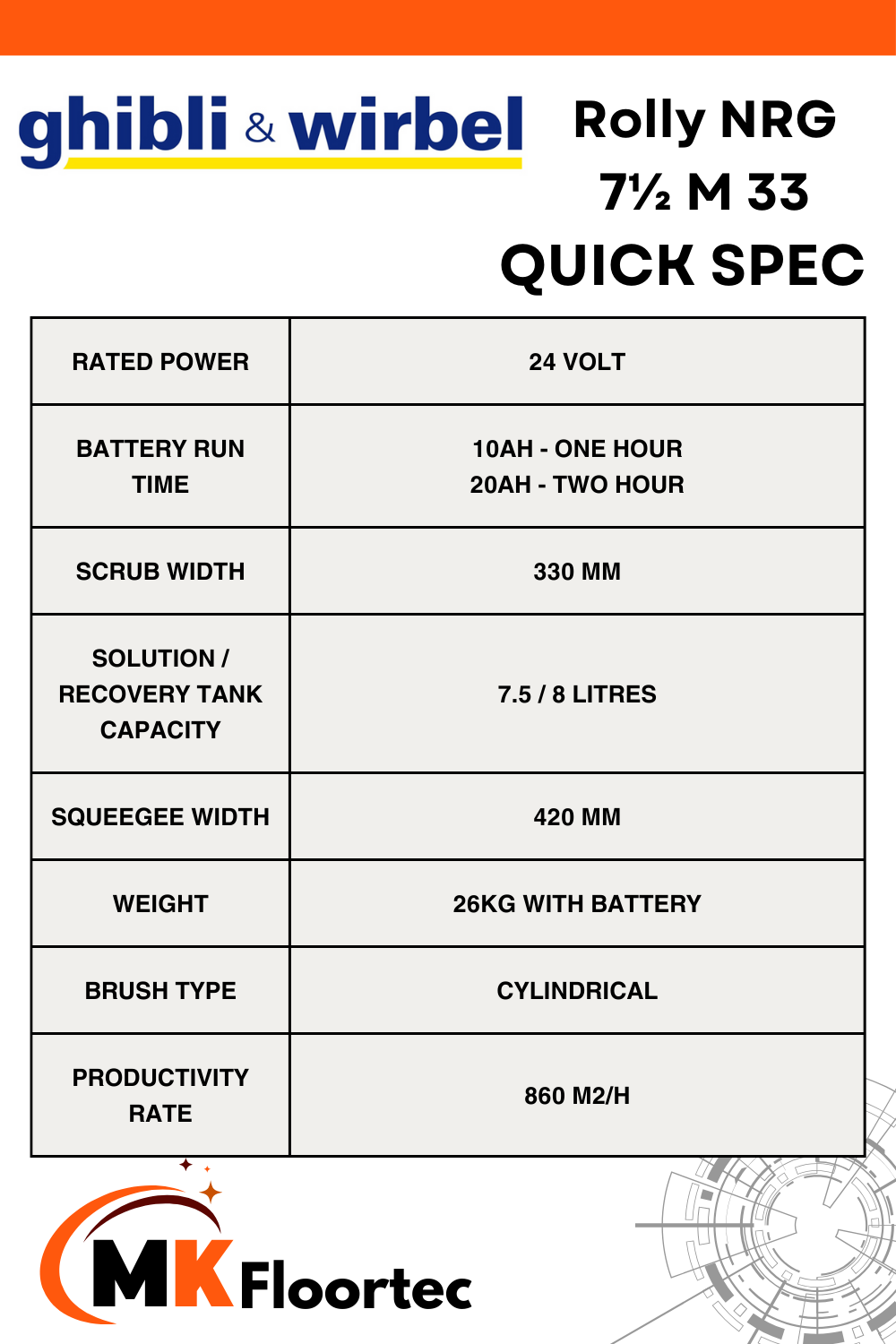 This machine is also offered in a mains cable-operated version; for a more budget-friendly option, please see the Ghibli & Wirbel ROLLY NRG 7½ E 33 Floor Scrubber Dryer model.