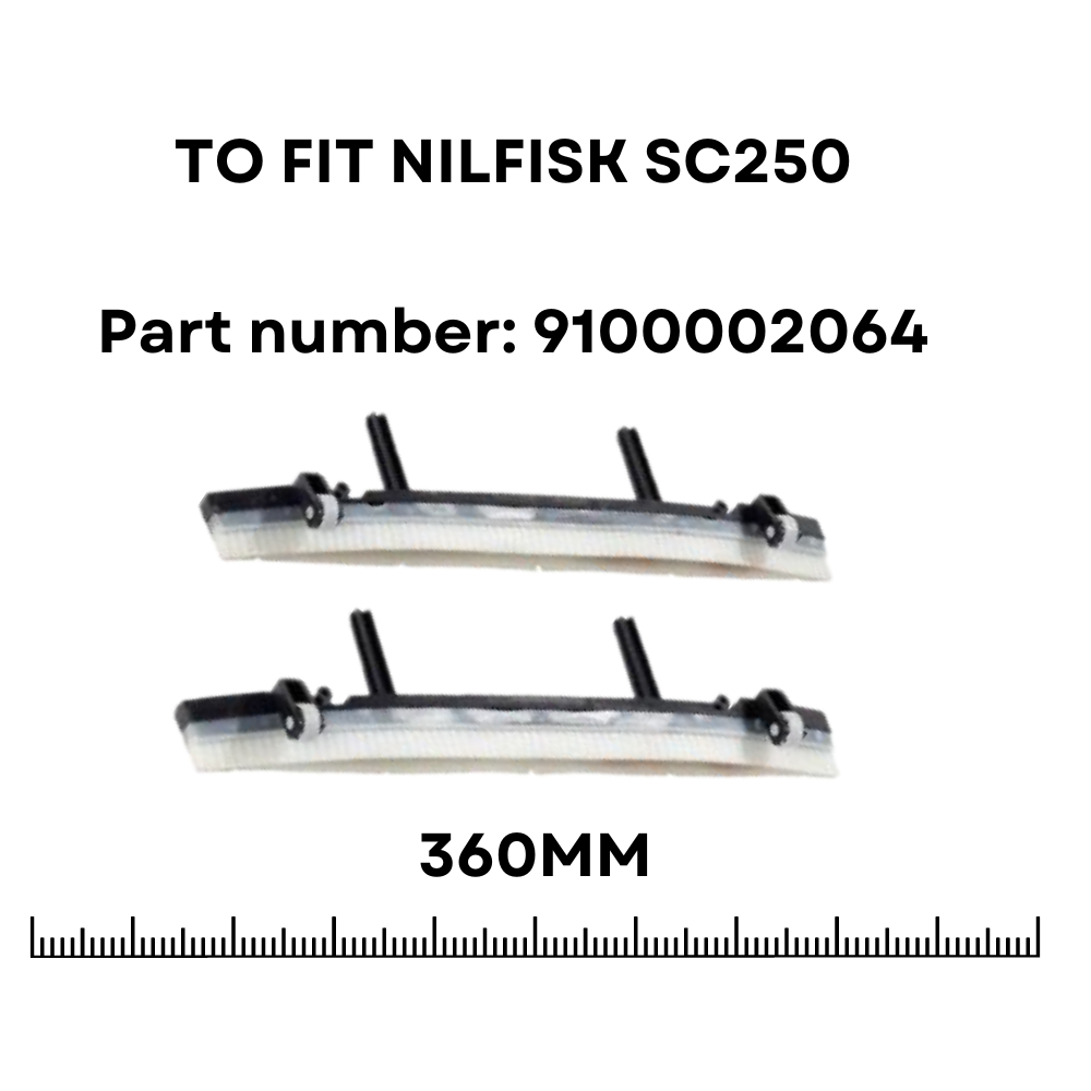 Genuine replacement Nilfisk 9100002064 SC250 Replacement Squeegee Blade Set. 360mm, supplied as a nozzle kit complete with squeegee blades and cartridge. Ready to clip into the machine.