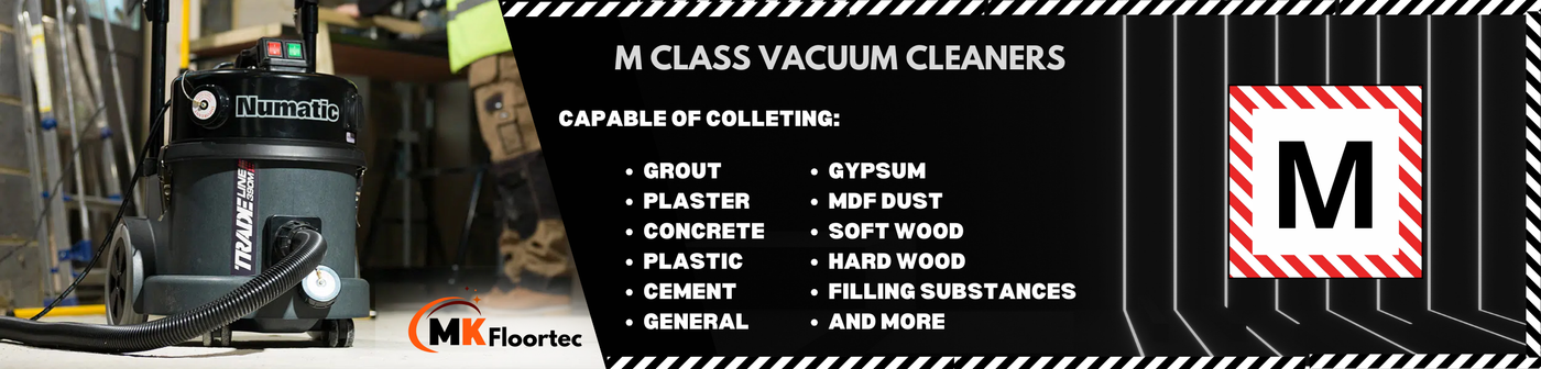 M Class dust extractors and vacuum cleaners are high-quality, industrial-grade systems meticulously designed to meet strict safety standards for handling hazardous dust and debris. The "M" designation stands for "Medium," indicating their filtration efficiency and the variety of particles they are capable of capturing. These dust extractors and vacuums are engineered to extract, trap and retain a minimum of 99.9% of all M dust particles ranging from 0.1 to 0.5 micrometers in size. Common examples of M-class substances include filling materials such as plaster, grout, and cement. Additionally, pine wood dust and general construction site waste fall within this category.
