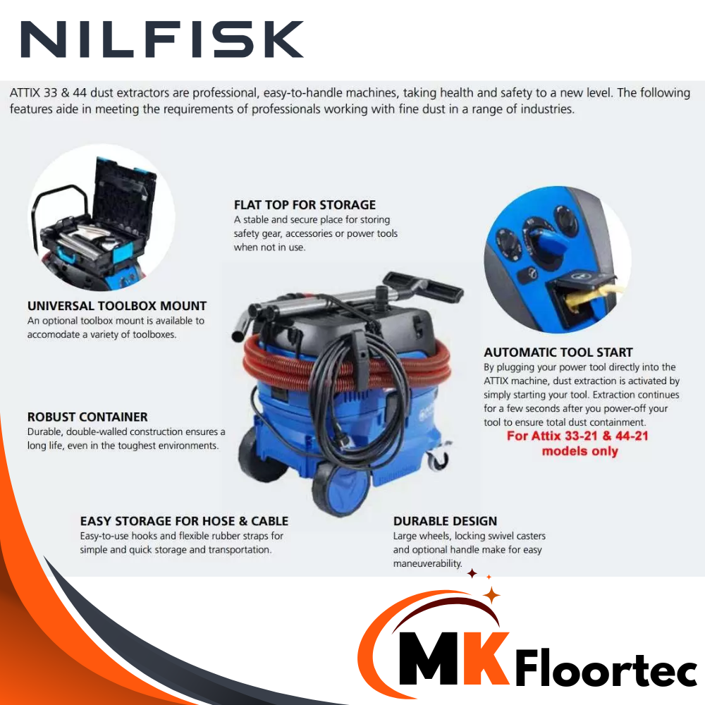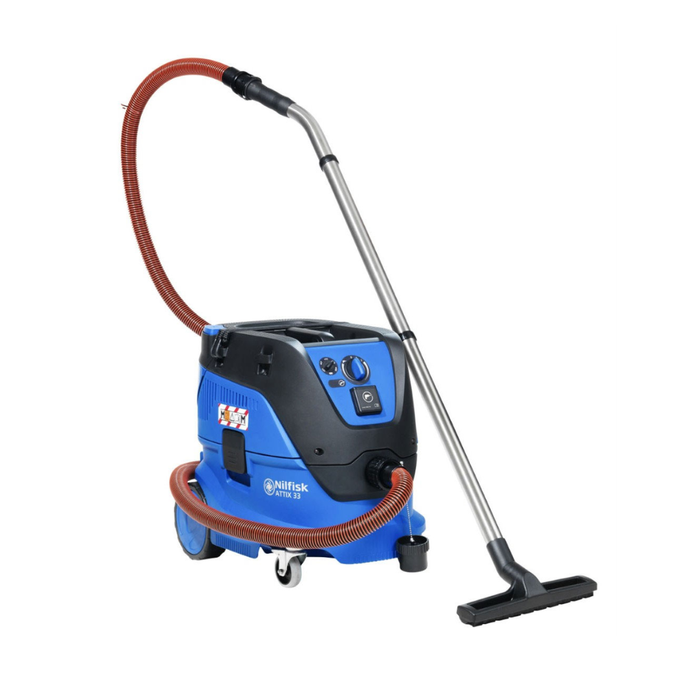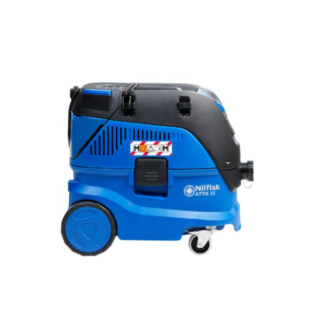 This model from the Nilfisk Attix series incorporates an innovative filtration system, exceptional performance, and a robust design, all with M-class dust certification. It is powered by either a 1400 Watt motor for the 240-volt option or a 1200 Watt motor for the 110-volt option. The ATTIX 33 M is engineered to deliver increased suction power and includes a sealed dust system along with automatic filter cleaning capabilities, making it suitable for demanding industries like construction, where worker safety is paramount. The vacuum comes equipped with a comprehensive kit of tools and attachments, including a 4-metre hose, power tool adaptor, and storage straps.