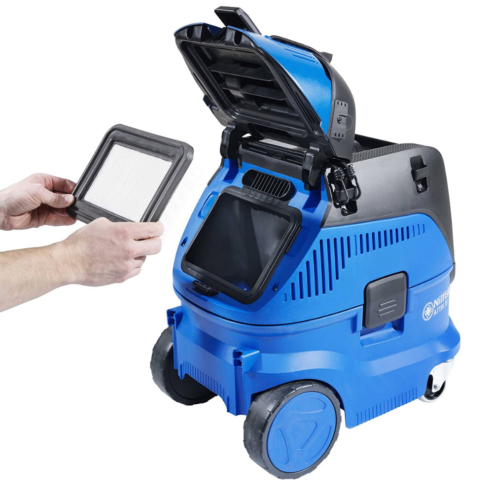 Key features include the InfiniClean™ automatic filter cleaning system, which mitigates performance drop-off, and a PTFE Long-Life Filter that ensures a filtration efficiency of at least 99.9% due to its non-stick membrane. The Push&Clean™ semi-automatic filter cleaning system is available on select models, enhancing usability. The vacuum also holds a Dust Class H Certification, making it safe for handling hazardous materials like asbestos. Its unique dual filter solution is designed for H-class/HEPA filtration using a three-stage process.