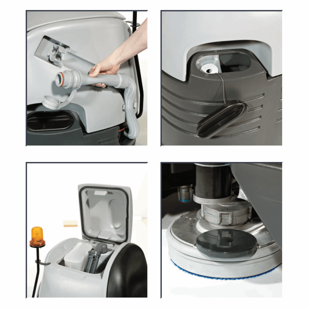 Notable features include a low noise mode, allowing for daytime cleaning in noise-sensitive areas. The BR652 series simplifies operations with its intuitive steering wheel control, which synchronises the deck's movement with the machine's turns—when the machine turns, the deck follows suit.