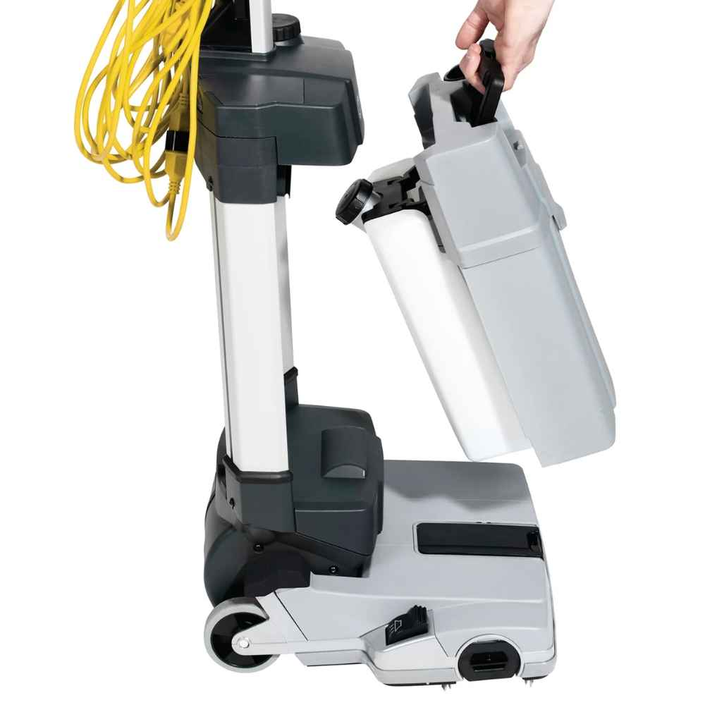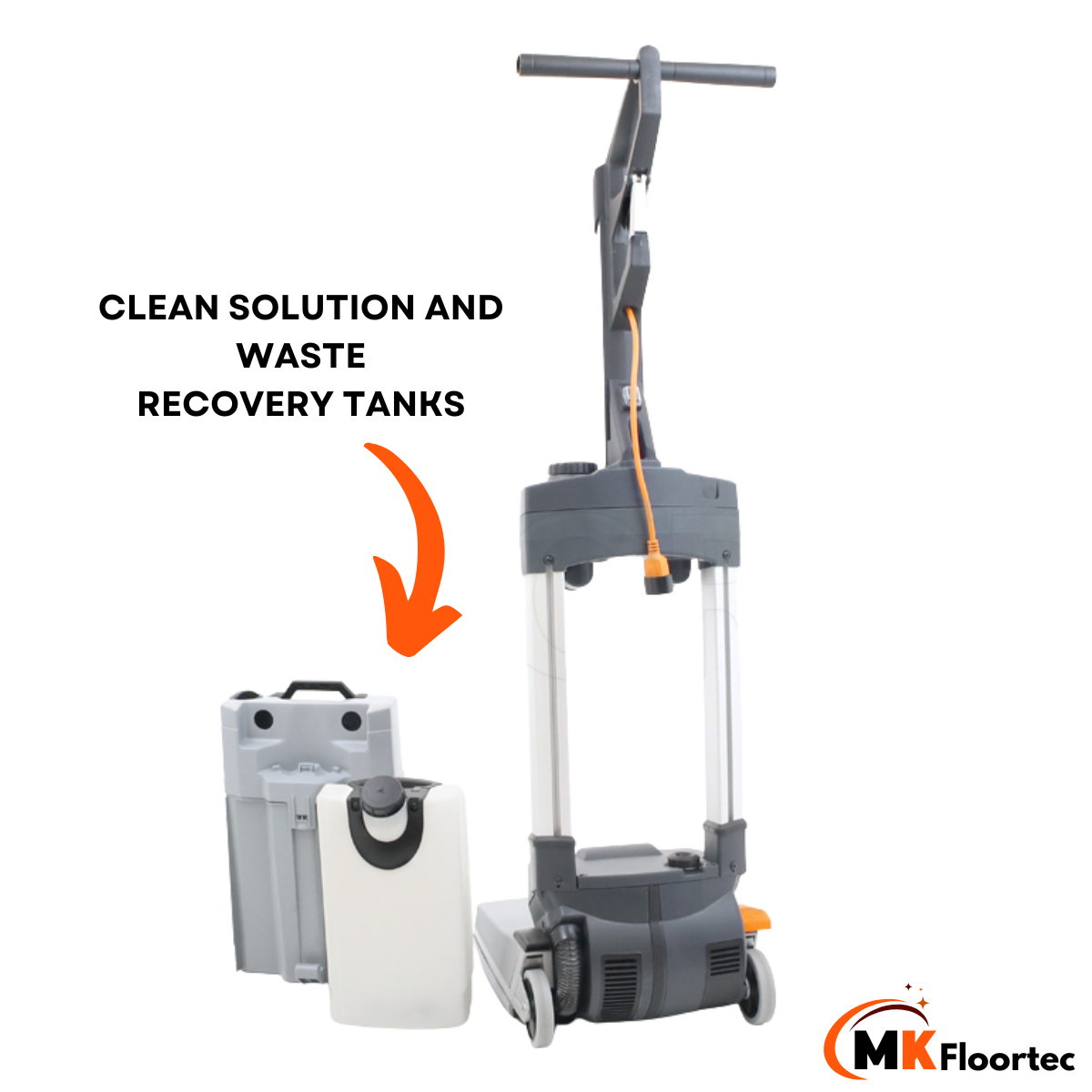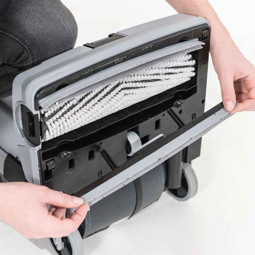 The compact design of the easily removable clean solution and waste recovery tanks allows for convenient filling and emptying in sinks. Furthermore, the detachable suction squeegee blades and cylindrical brush roller make cleaning and maintaining the machine a breeze. The cylindrical cleaning roller brush is highly effective for both smooth surfaces and tiled floors featuring grout lines.