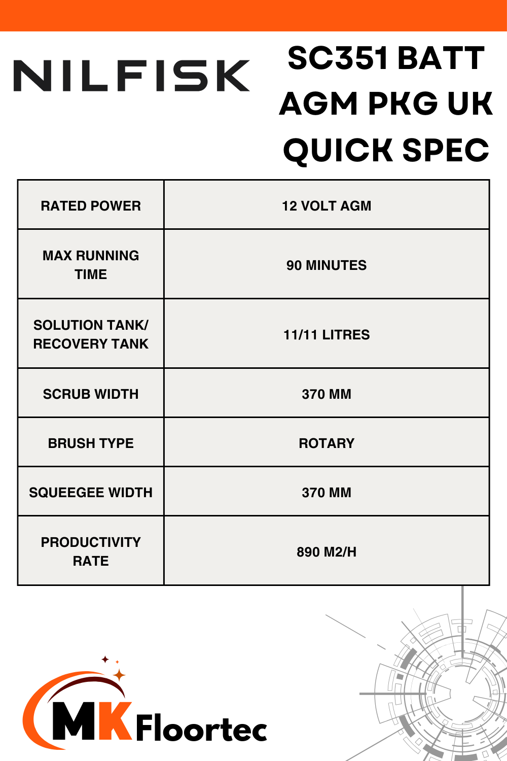 The Nilfisk SC351 Floor Scrubber Dryer is battery powered and designed for efficient cleaning with the ability to scrub and dry both forward and backward without cords. It features an 11-litre capacity, 15-inch scrubbing deck and a compact design, complemented by a rotary action motor that applies an impressive 30kg of pressure to the floor, making it versatile for various flooring tasks.