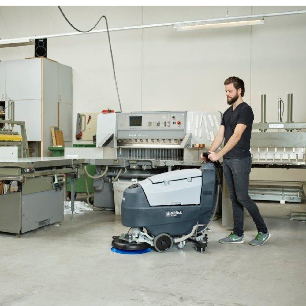 The Nilfisk SC401 43B Floor Scrubber Dryer is a battery powered professional floor cleaning machine designed for outstanding durability, boasting are 30-litre capacity and a 430mm (17-inch) scrub deck. This makes it a popular choice in various industries that demand a high-quality semi-compact cordless machine, including education, healthcare, and hospitality.