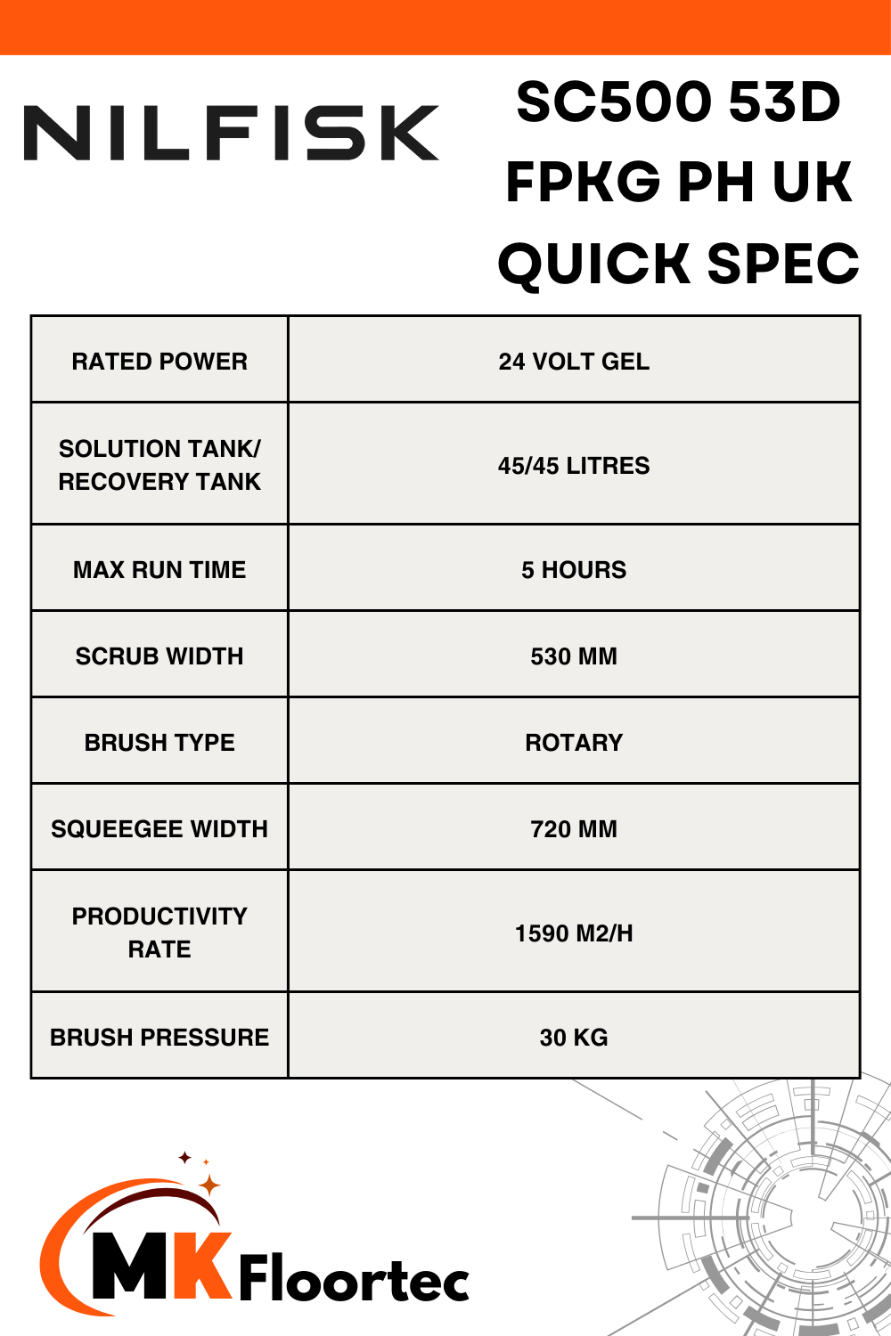 The Nilfisk SC500 53B Floor Scrubber Dryer is a premium 45-litre capacity walk-behind scrubber dryer floor cleaning machine featuring a 530mm scrub width, designed to enhance productivity while minimising cleaning costs. It offers a Lithium-Ion battery option, allowing users to select their preferred battery configuration, with each option providing over three hours of running time between charges.