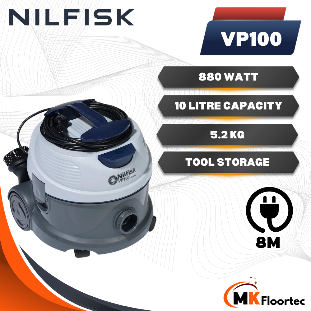 The Nilfisk VP100 vacuum cleaner is exceptionally priced and lightweight, tipping the scales at only 5.2 Kg, making this commercial cylinder vacuum effortless to handle, conducive for everyday use. Its lightweight structure allows for seamless mobility between different areas. 880 Watt featuring an 8.5 litre dry capacity.