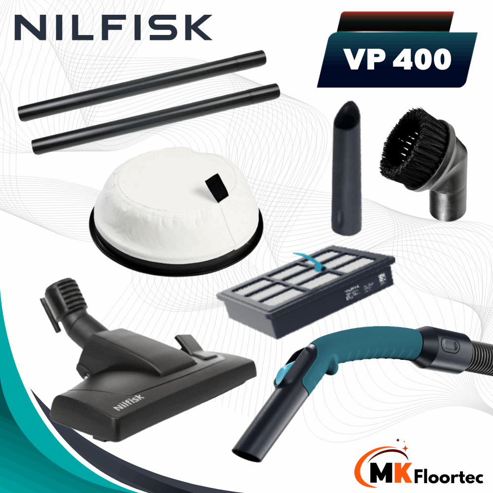 The Nilfisk VP 400 HEPA comes equipped with a 2-meter premium comfort grip hose, a 2-piece stainless steel straight wand tube set, a combination floor tool brush nozzle, a dusting brush, a crevice nozzle, a HEPA 13 cartridge filter, and an internal sack filter.