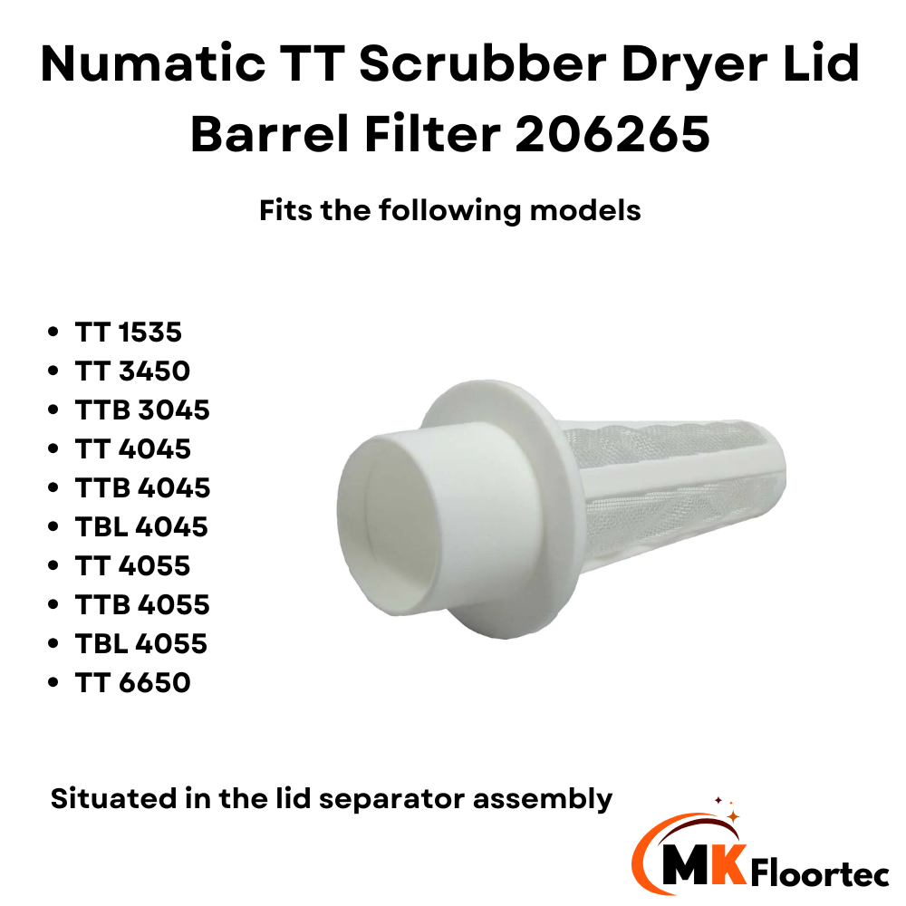 Numatic 206265 TT Floor Scrubber Dryer Lid Barrel Filter. Separator suction barrel filter. This White gauze barrel filter is positioned beneath the black shut-off flap within the lid separator assembly. Please see image 4 for location. Its purpose is to capture debris, preventing it from being drawn into the suction hose and reaching the vacuum motor.