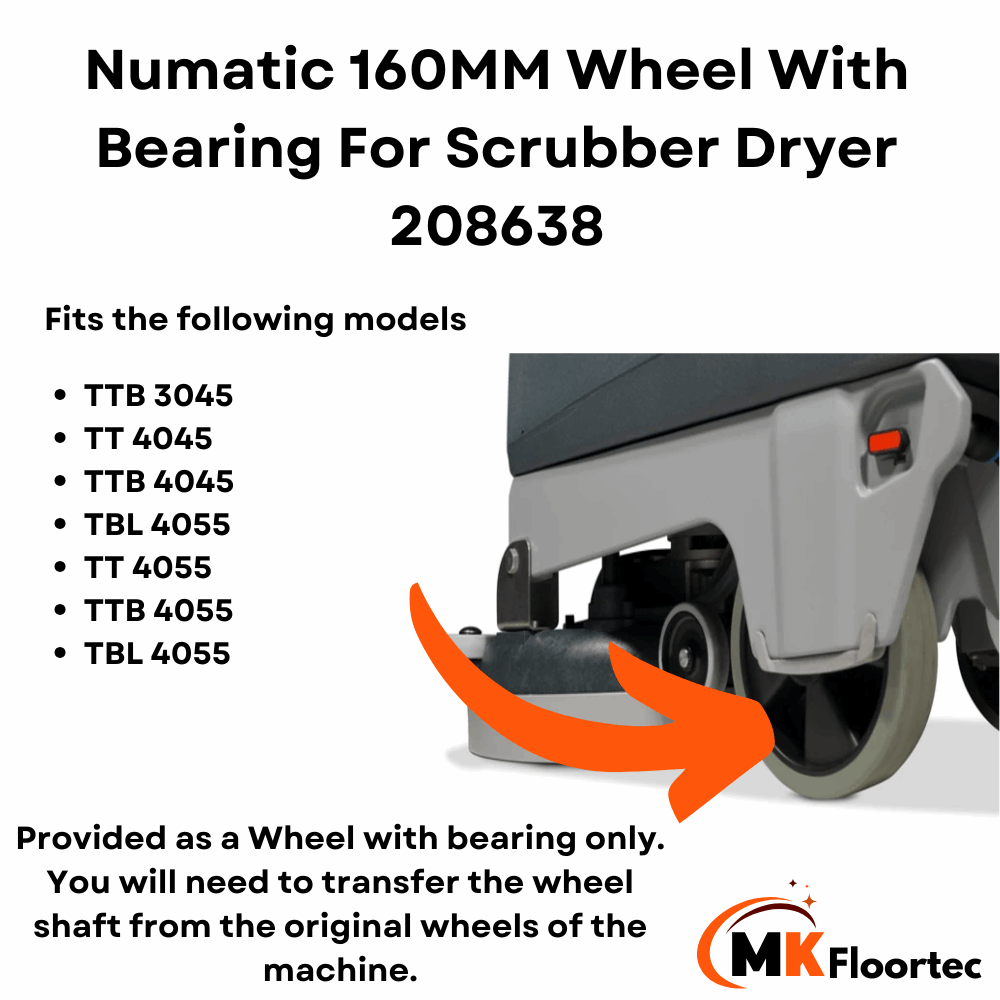 This is a genuine Numatic 208638 160MM Wheel With Bearing & Tyre, designed for the majority of pedestrian mid-sized Numatic Scrubber Dryers.
