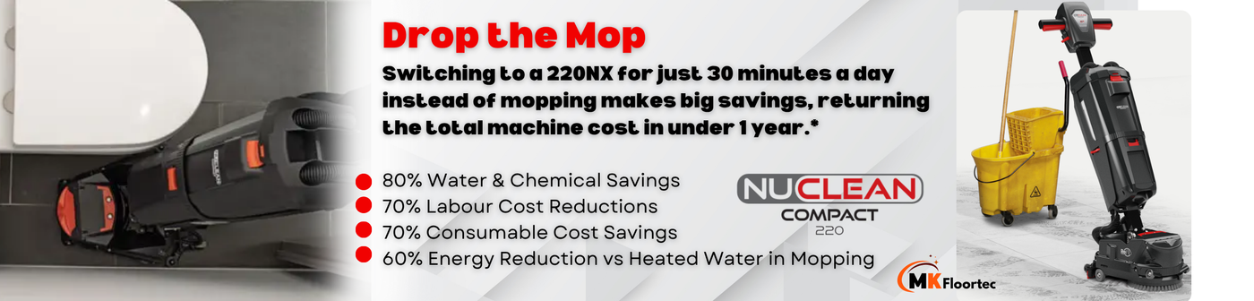 Transitioning to a 220NX for only 30 minutes daily instead of traditional mopping results in significant savings, allowing for the total cost of the machine to be recouped in less than a year. *The payback is calculated for a 300m² area cleaned, 7 days a week, with labor costs at £11.44 per hour compared to wet mopping.