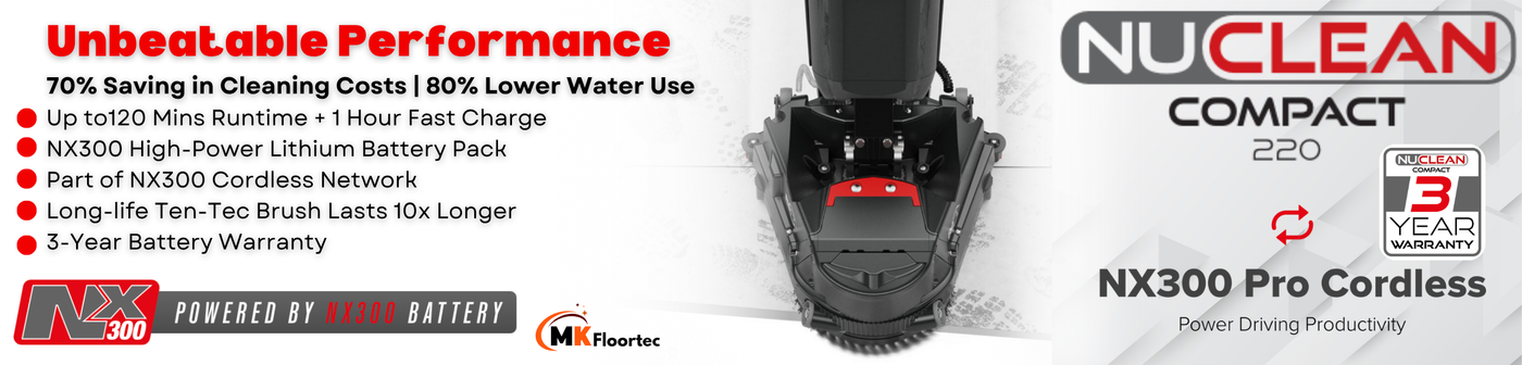 The Numatic 220NX Nuclean Compact Floor Scrubber Dryer cleans in places others can’t: The 220mm Cleaning Width Makes Hard-to-Reach Areas Easy to Tackle. The 220NX offers the cleaning power of larger scrubber dryers while maintaining an ultra-compact design. It allows access to areas that are typically cleaned only by mopping, resulting in enhanced cleaning outcomes and reduced labor costs.