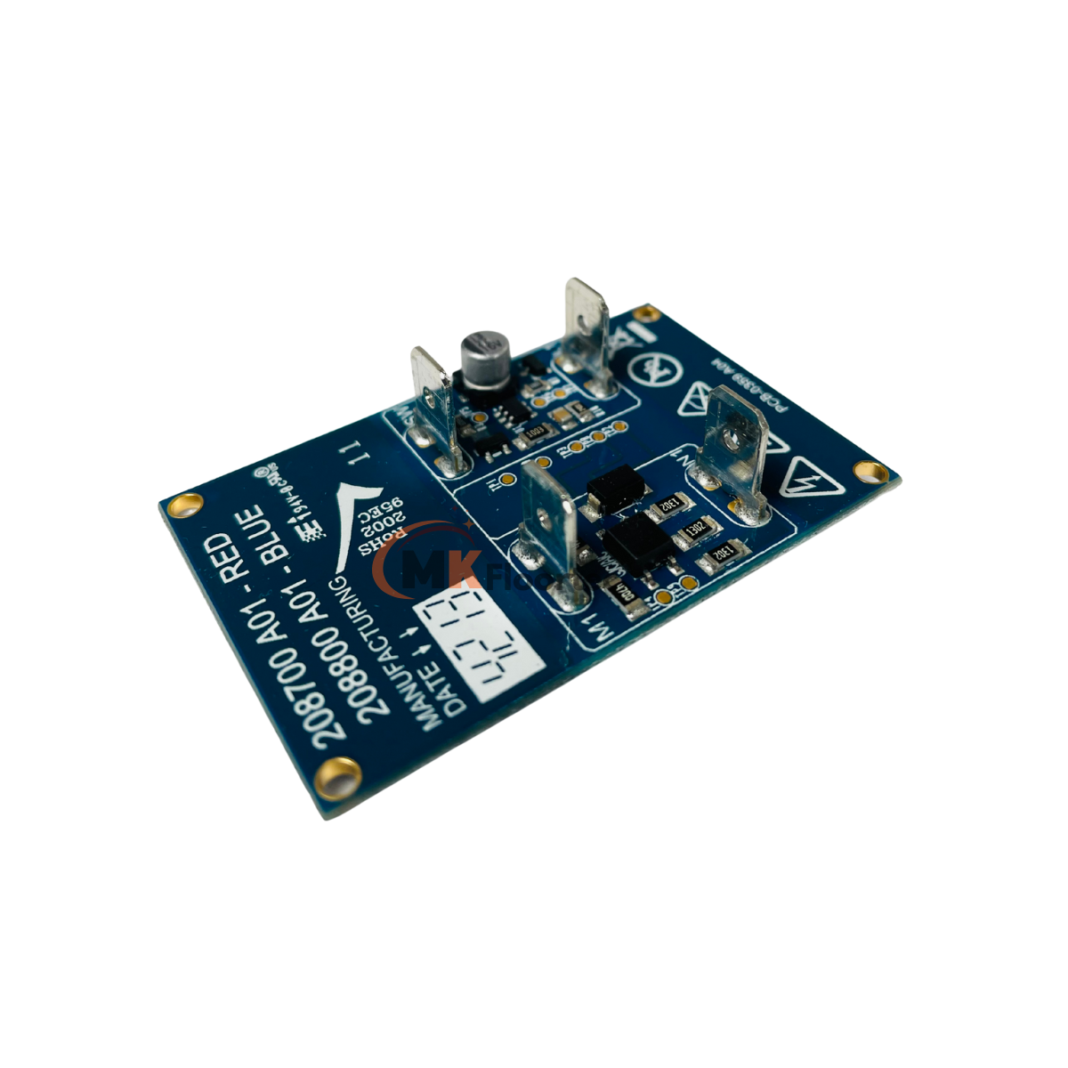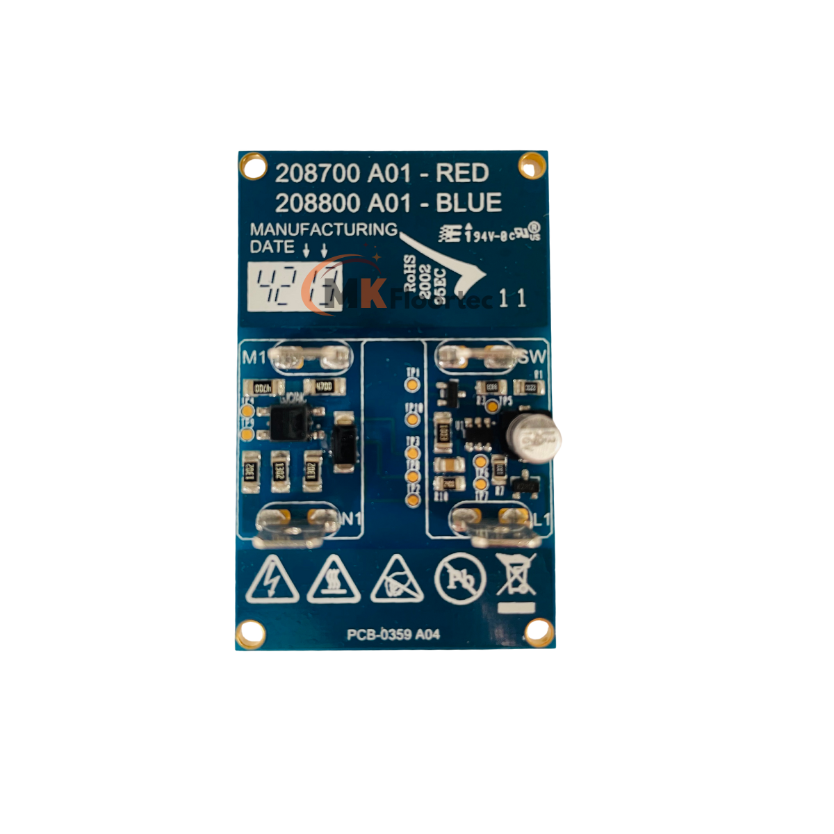 It replaces Numatic part numbers: 208700, 208800, 321990, 32190, 321990, 208100, and 208428 (red or blue). It also replaces the green 208100 board and is designed for models featuring the red hi-low Autosave switch.