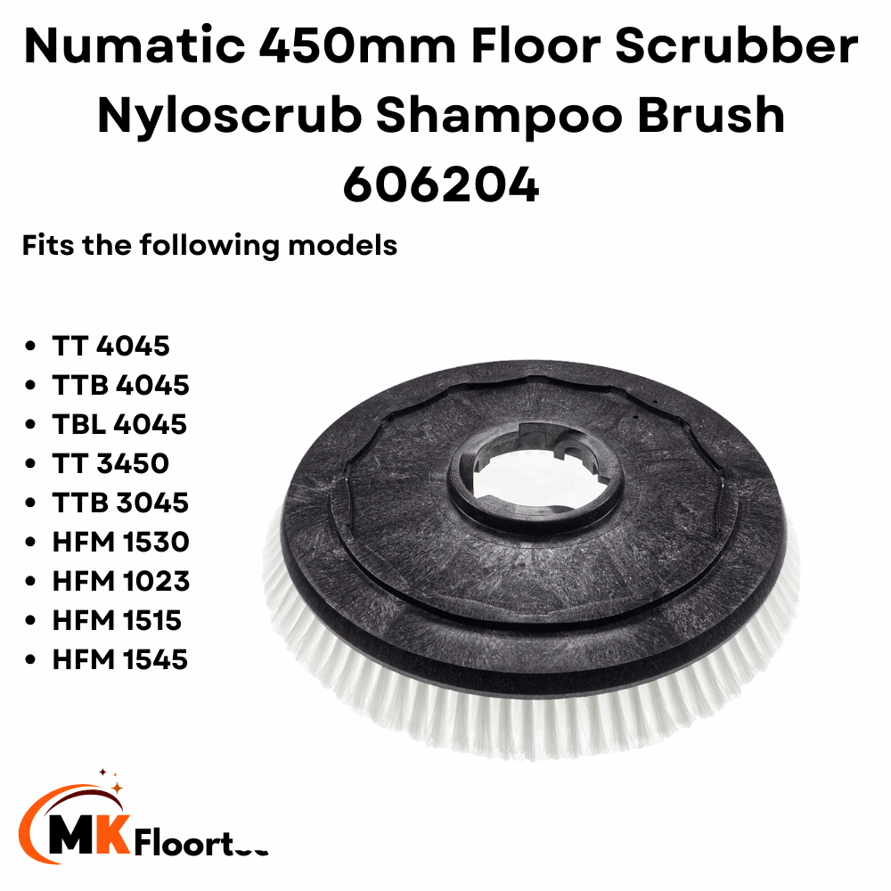The Numatic 450mm Nyloscrub Carpet Shampoo Brush 606204 is specifically designed for rotary shampooing and bonnet buffing of carpeted surfaces. Additionally, it can be utilised with Numatic scrubber dryers and scrubbing machines for lighter scrubbing tasks on hard floors, including sensitive wooden surfaces.