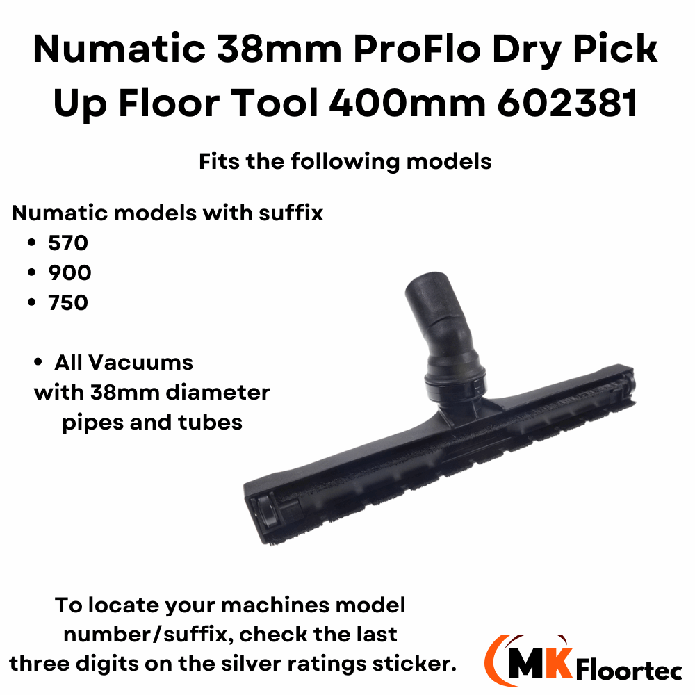 Genuine Numatic 602381 38mm ProFlo Dry Pick Up Floor Tool 400mm for vacuum cleaners. With a 38mm diameter fitting and measuring 400mm in width. Perfect for hard floors when utilised with industrial-grade machines, its durable design makes it well-suited for construction sites.