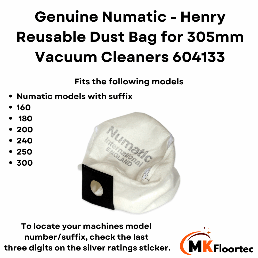This reusable bag is compatible with all Numatic vacuum cleaner models that have the suffixes: 160, 180, 200, 240, 250, and 300. Including and not limited to;