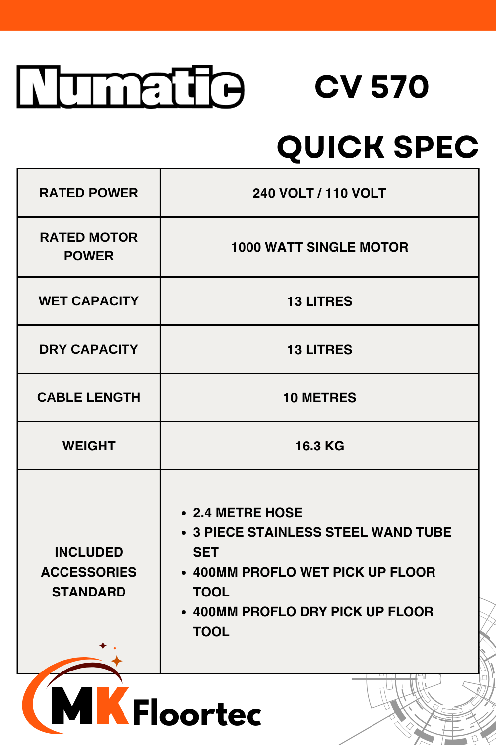The Numatic CV 570 CombiVac wet and dry vacuum cleaner is equipped with a powerful 1000 Watt single motor and a 13-litre capacity for both wet and dry tasks, makes cleaning effortless, even in the dirtiest environments.