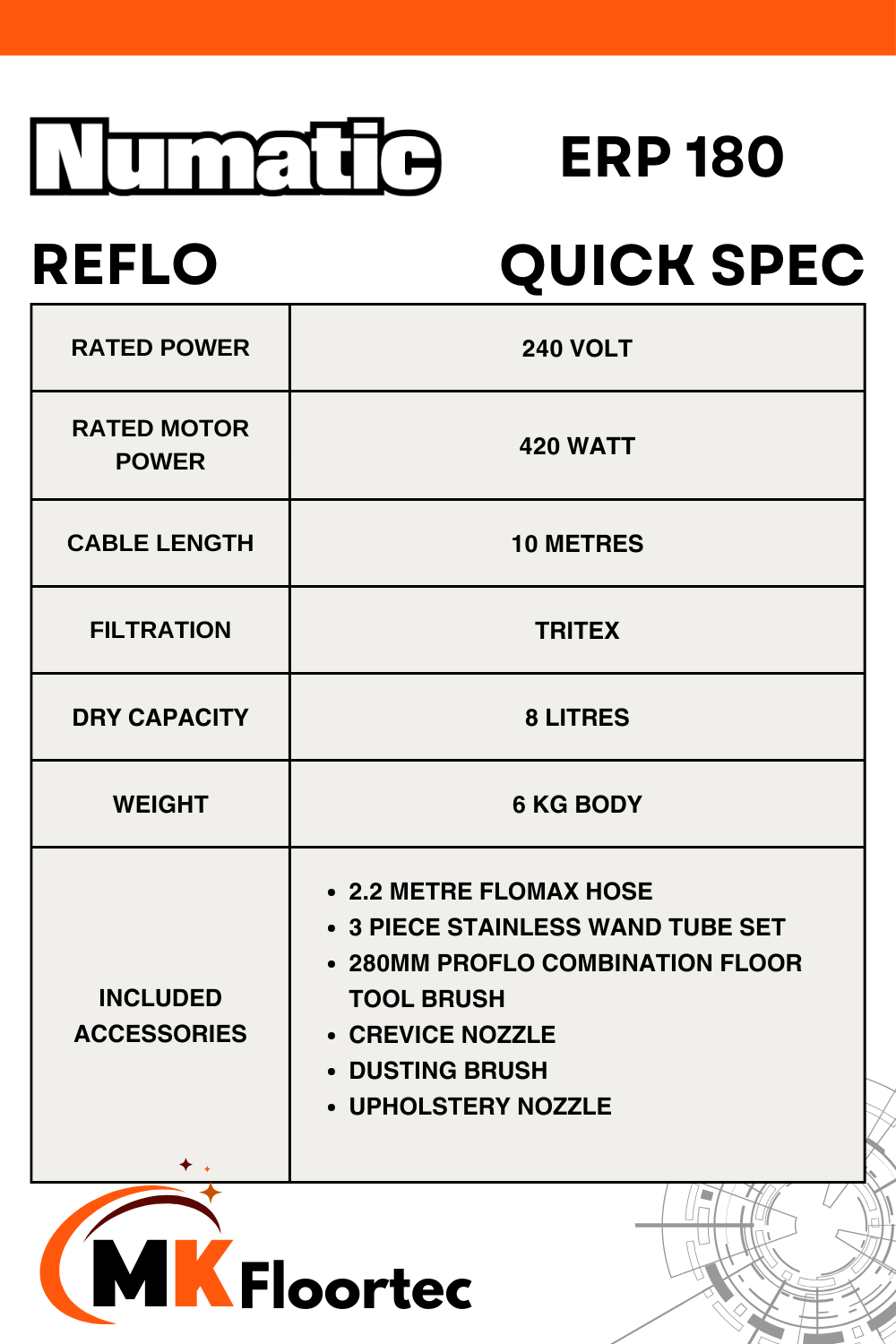 Crafted with Re-flo technology. The Re-flo initiative strives to reduce reliance on virgin plastic while ensuring the high quality you have come to expect from Numatic International products. The ERP180 is made with recycled plastic materials, making it a sustainable option compared to other vacuum cleaners.