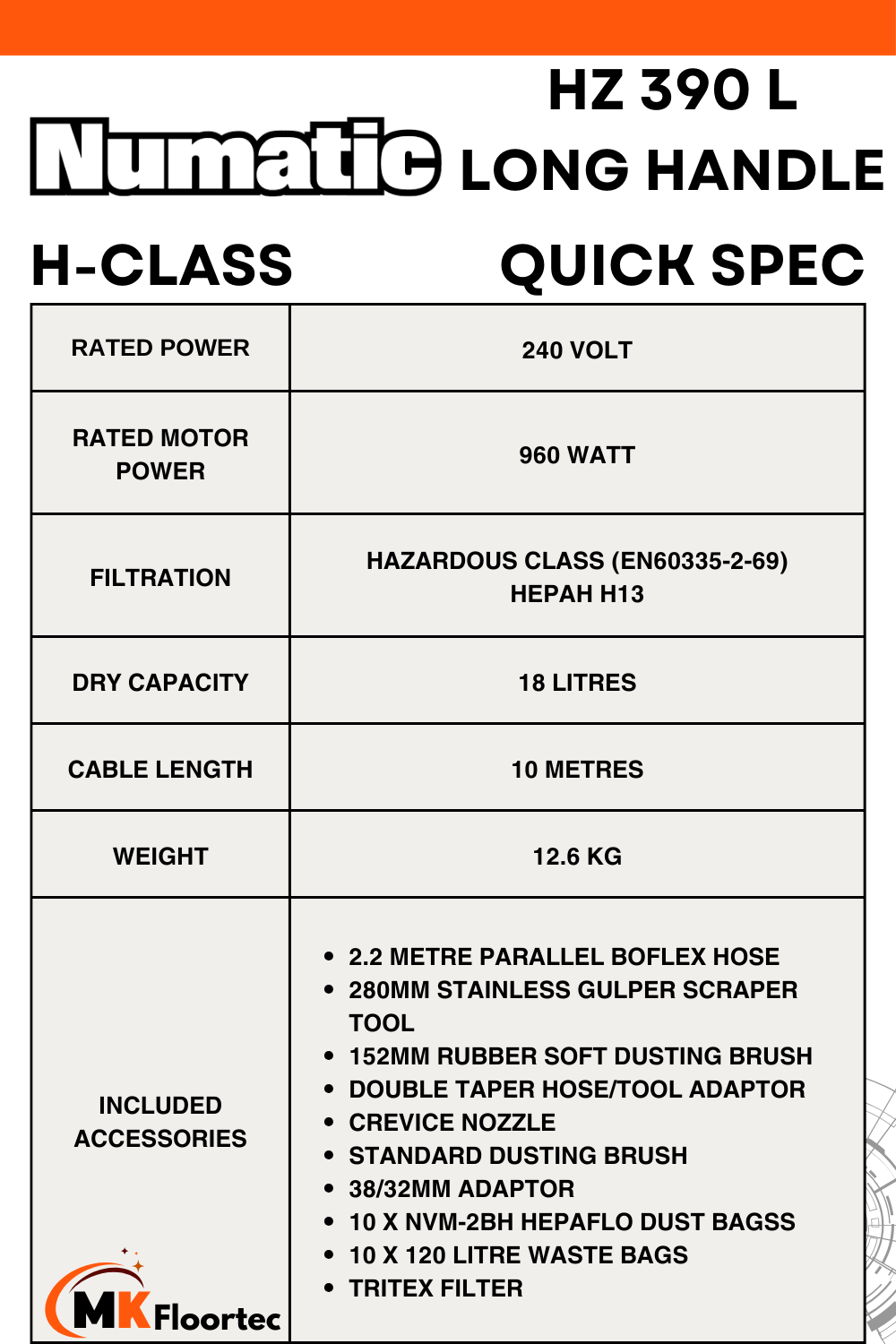 The Numatic HZ390L H-Class Hazardous dust vacuum cleaner extractor. 'L' for Long handle. This compact Hazardous unit with a generous 18-Litre capacity and 960 Watt motor is ideal for handling hazardous materials, meeting all necessary requirements. It is a fully upgraded HZ machine based on the 390 container design, featuring an H13 filter module and meeting the "H" standard EN60335-2-69. Featuring an extendable handle.