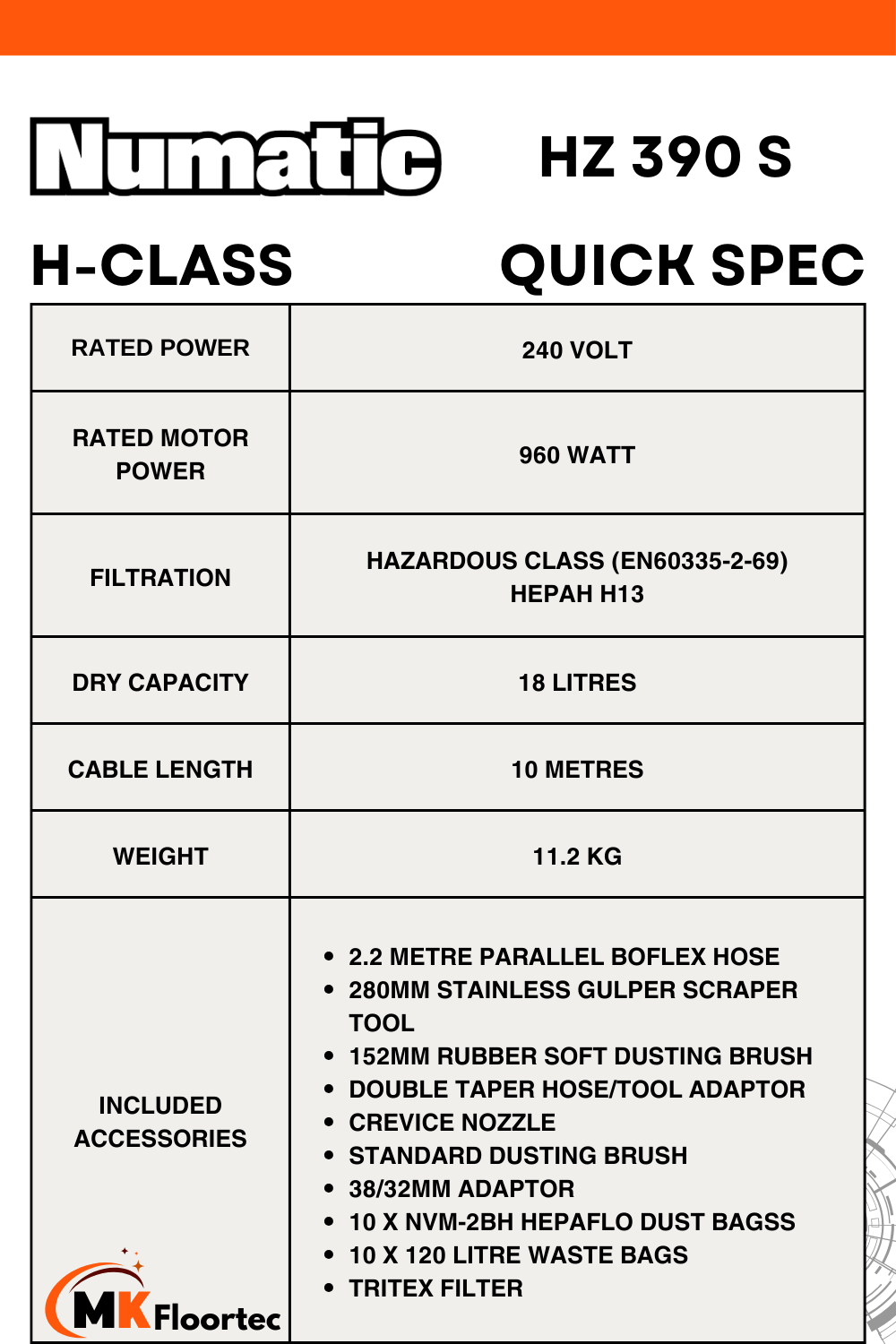 Equipped with a HEPA H13 filter, TriTex filter, and HepaFlo Filter Bags, the HZ390 complies with the H-Class standards, boasting an efficiency rating of 99.95%.