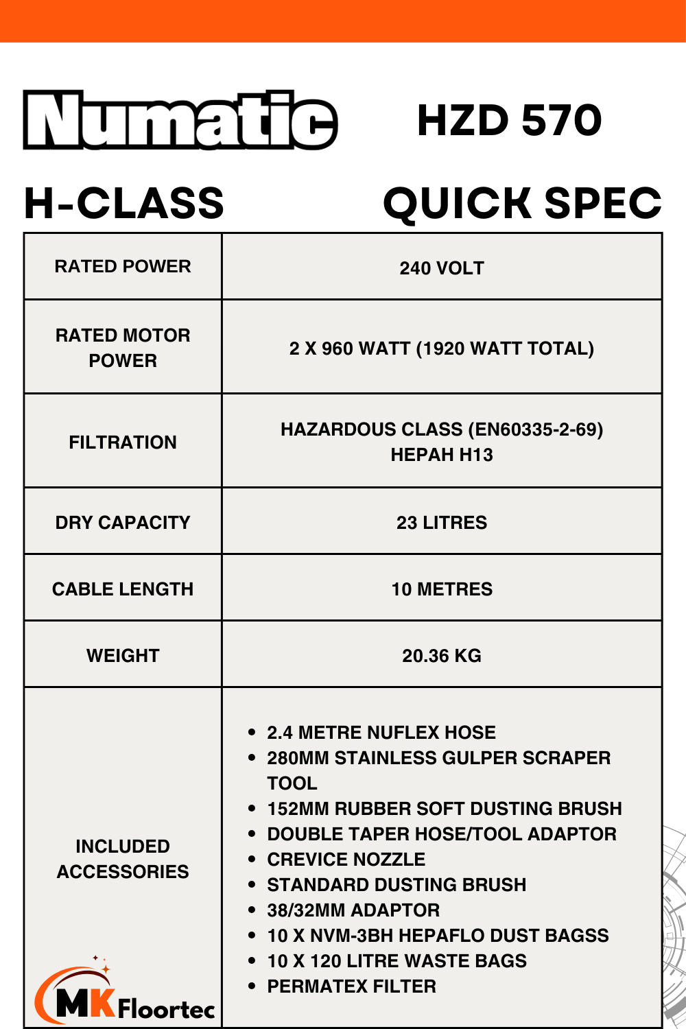 The Numatic HZD570 H-Class Hazardous dust vacuum cleaner extractor, equipped with powerful Twin 960 Watt motors and a 23-litre capacity, is crucial for managing environments with potentially hazardous dust, such as Silica and Asbestos. Its advanced H13 Filtration system provides 99.95% filtration efficiency, effectively trapping collected fibers and H-class dust within the drum.