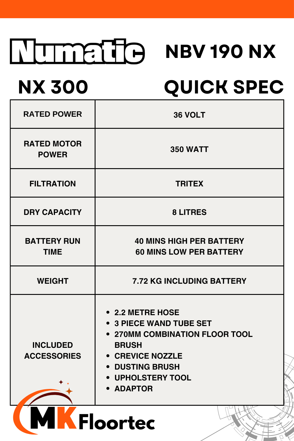 The Numatic NBV190NX is part of the NX300 interchangeable battery network of cleaning machines from Numatic. The NBV190NX operates with a single battery at a time, offering 60 to 80 minutes of use depending on the cleaning task. To ensure uninterrupted cleaning, additional batteries can be purchased. Each battery charges efficiently, reaching a full charge in two hours and 80% in just one hour. This system allows for continuous operation, as one battery can be used while the other charges, supporting round-the-clock cleaning if needed.