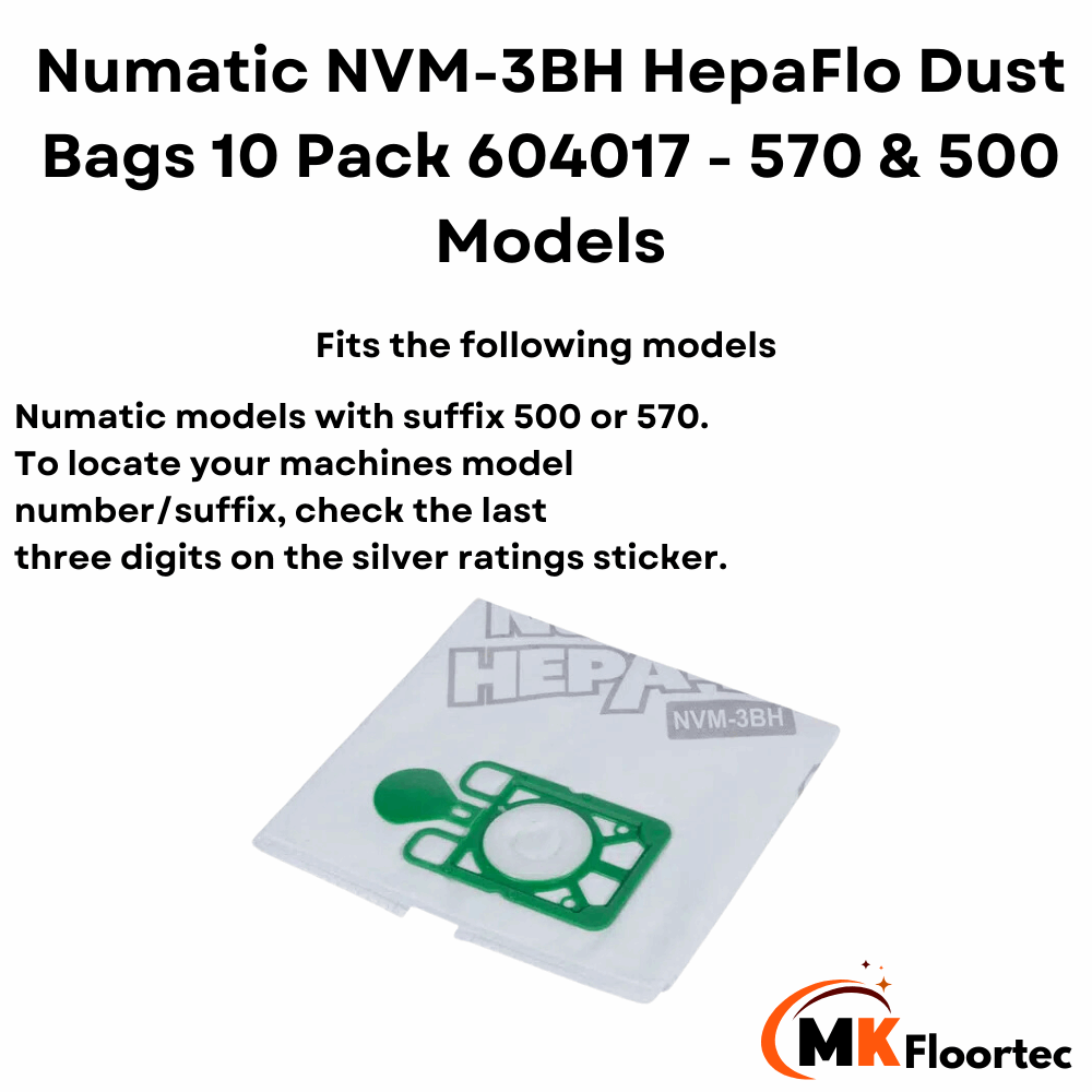 Genuine Numatic NVM-3BH HepaFlo Vacuum Dust Bags - 10 Pack - 570 & 500 Models, specifically designed for use with some of Numatics' larger vacuum cleaners, including the 500 and 570 sized ranges. Using dust bags during dry vacuum cleaning is essential as they protect the secondary filters and the vacuum motor, helping to extend the machine's lifespan. Pack of 10.