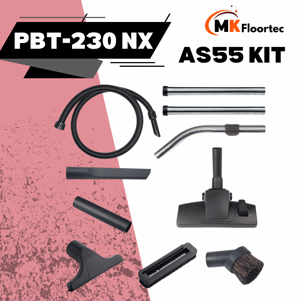 The PBT230NX Vacuum comes equipped with an extensive tool and accessory set that includes a 2.2m hose, a 3-piece stainless steel wand tube set, a combination floor tool head, and a complete Handy kit featuring a crevice nozzle, dusting brush, upholstery nozzle, and tapered adaptor. The wand tube with the floor tool can be conveniently mounted on the rear of the machine, while all other tools can be stored onboard in the storage caddy. This makes the PBT230NX a cordless, mobile cleaning station with everything you need within reach.