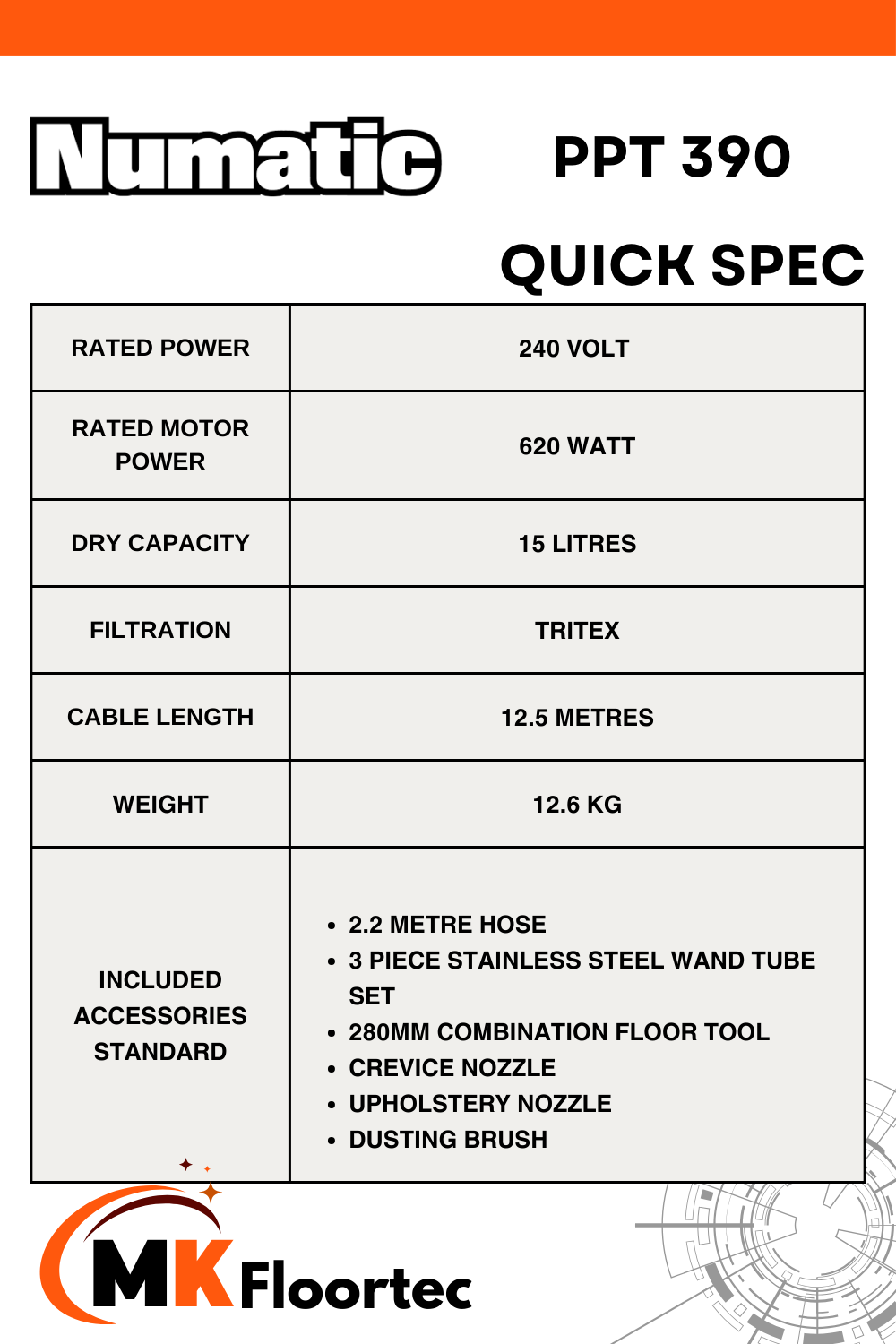 The Numatic PPT 390 trolley vacuum cleaner represents an innovative solution designed for ease of handling. With a generous 15-litre capacity and a 12.5-metre mains cable, this vacuum is equipped with a comprehensive array of tools and accessories, making it an excellent choice for scenarios where transporting a vacuum cleaner over a distance is advantageous, rather than requiring the operator to carry it.