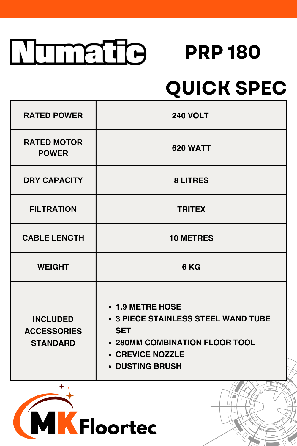 Whether it's carpets, hard floors, vehicles, stairs, or DIY tasks, the PRP180 is fully equipped and ready for action. Built for the long-haul with a 2-Year Commercial Warranty and a motor designed and tested beyond industry standard