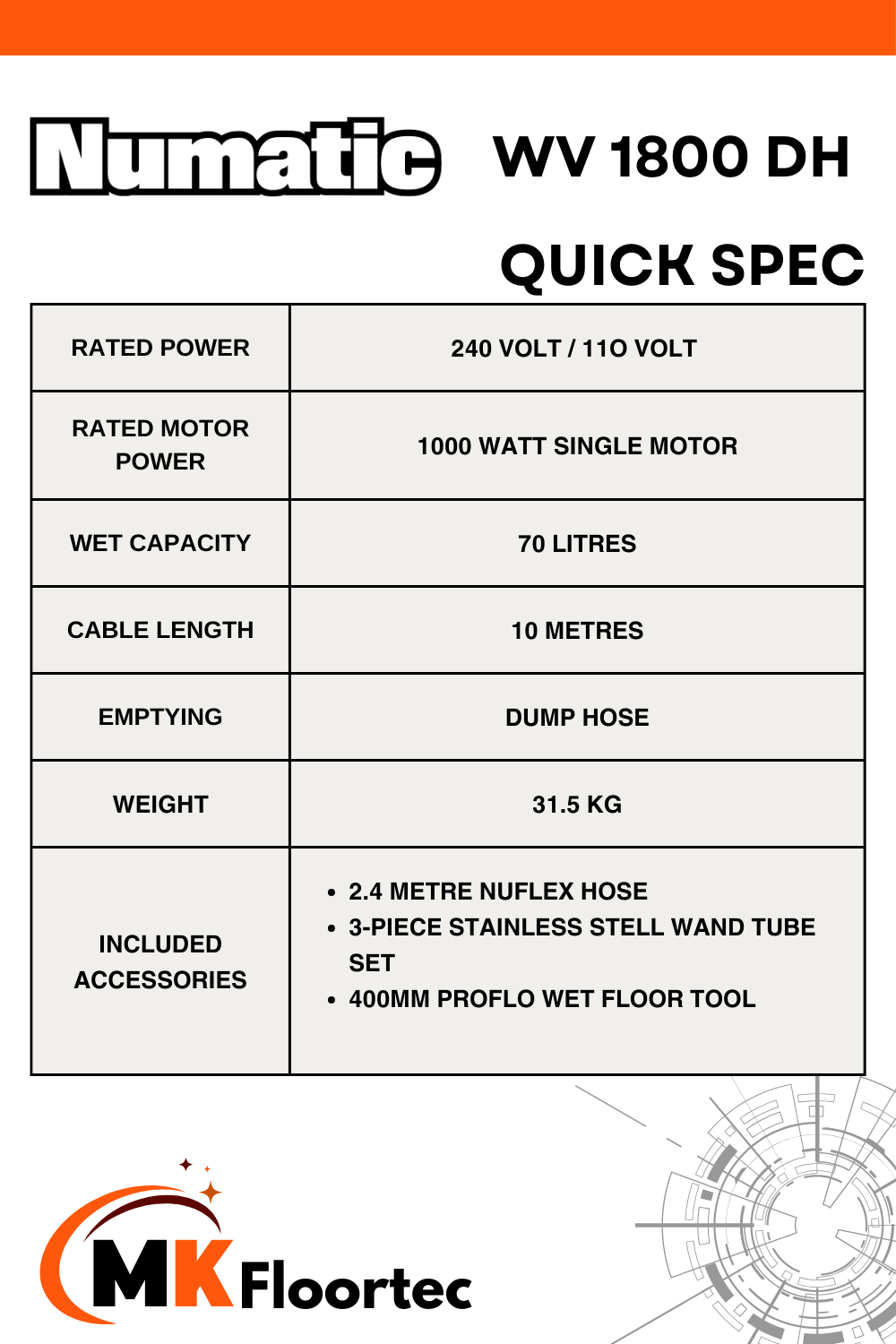 There is also a dual motor variant that offers enhanced power and performance. For more information, please check out the Numatic WVD1800DH model, which includes the dual motor feature.