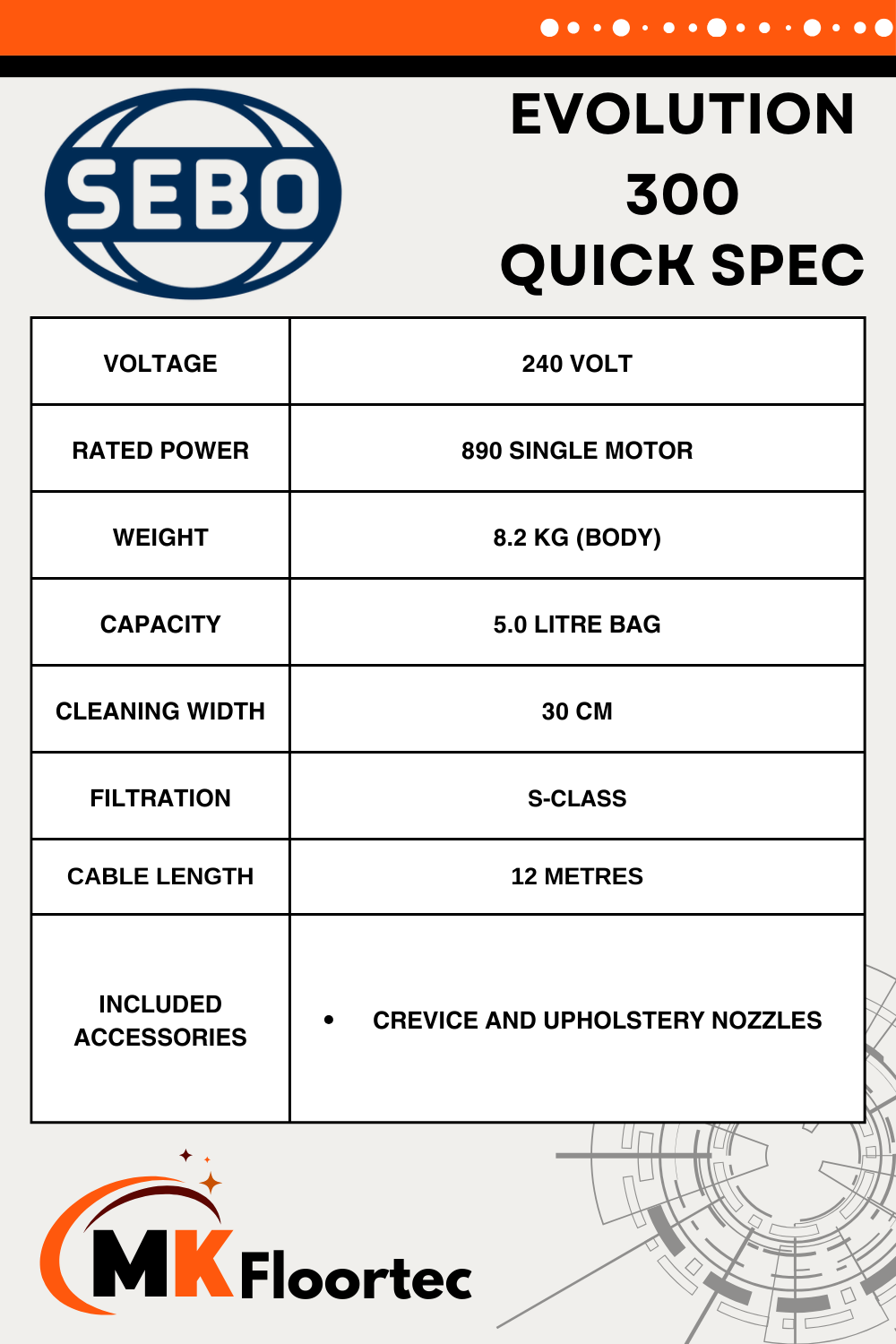 The Sebo 300 Evolution Upright Vacuum Cleaner, with a cleaning width of 30cm, is a commercial hoover engineered to meet the standards of the second stage of the European Ecodesign Directive for vacuum cleaners (EU No. 665-666/2013), featuring an optimised motor.