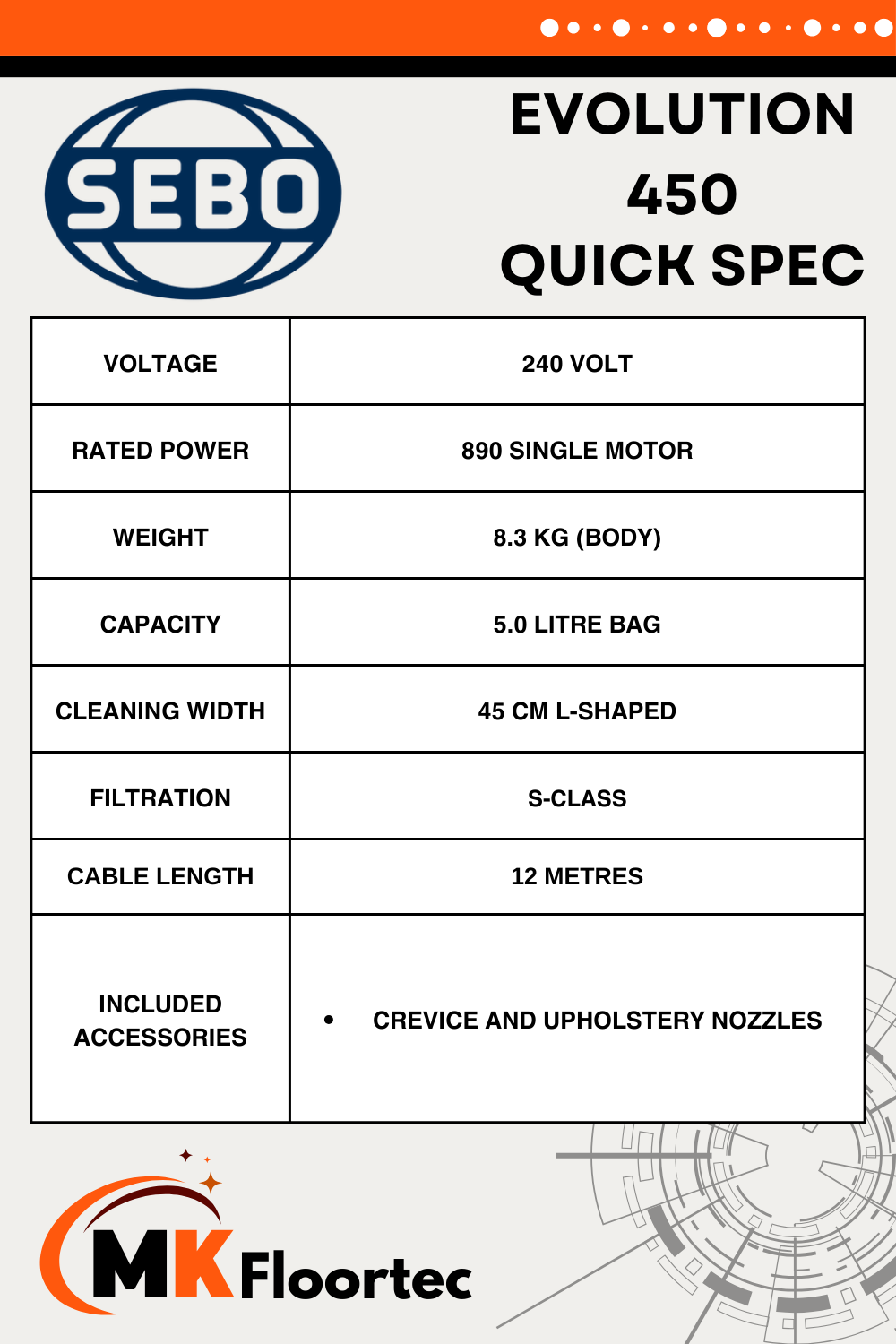 The Sebo 450 Evolution Upright Vacuum Cleaner is a wide-area upright hoover perfect for cleaning large commercial spaces, boasting an impressive L-shaped cleaning width of 45cm. It is designed to comply with the second stage of the European Ecodesign Directive for vacuum cleaners (EU No. 665-666/2013) and features an optimised motor.