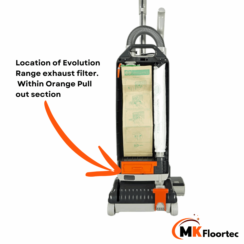 This is a genuine replacement Sebo 50170ER Evolution 300 - 350 - 450 Exhaust Filter designed for upright models of Sebo Evolution vacuum cleaners. It is situated at the rear of the machine, within the back door, housed under the bag in an orange pull-out drawer. It is important to note that a dirty or expired filter can adversely affect the machine's performance.