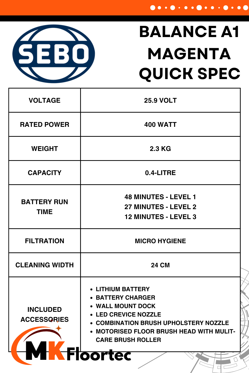 The Sebo Balance A1 Magenta is an innovative Cordless Stick Vacuum Cleaner, expertly crafted to tackle all types of floors and surfaces within your home. The Sebo Balance A1 merges decades of expertise with cutting-edge technology from a trusted worldwide vacuum cleaner brand. The Sebo Balance is the ideal battery-operated vacuum, offering balance and lightweight handling for effortless daily cleaning in a stunning Magenta hue. Engineered with precision by German designers, Balance A1 is ergonomic, lightweight, and adaptable, making it perfect for effective everyday vacuuming. It comes with a 2-year manufacturer warranty, contingent upon registration.