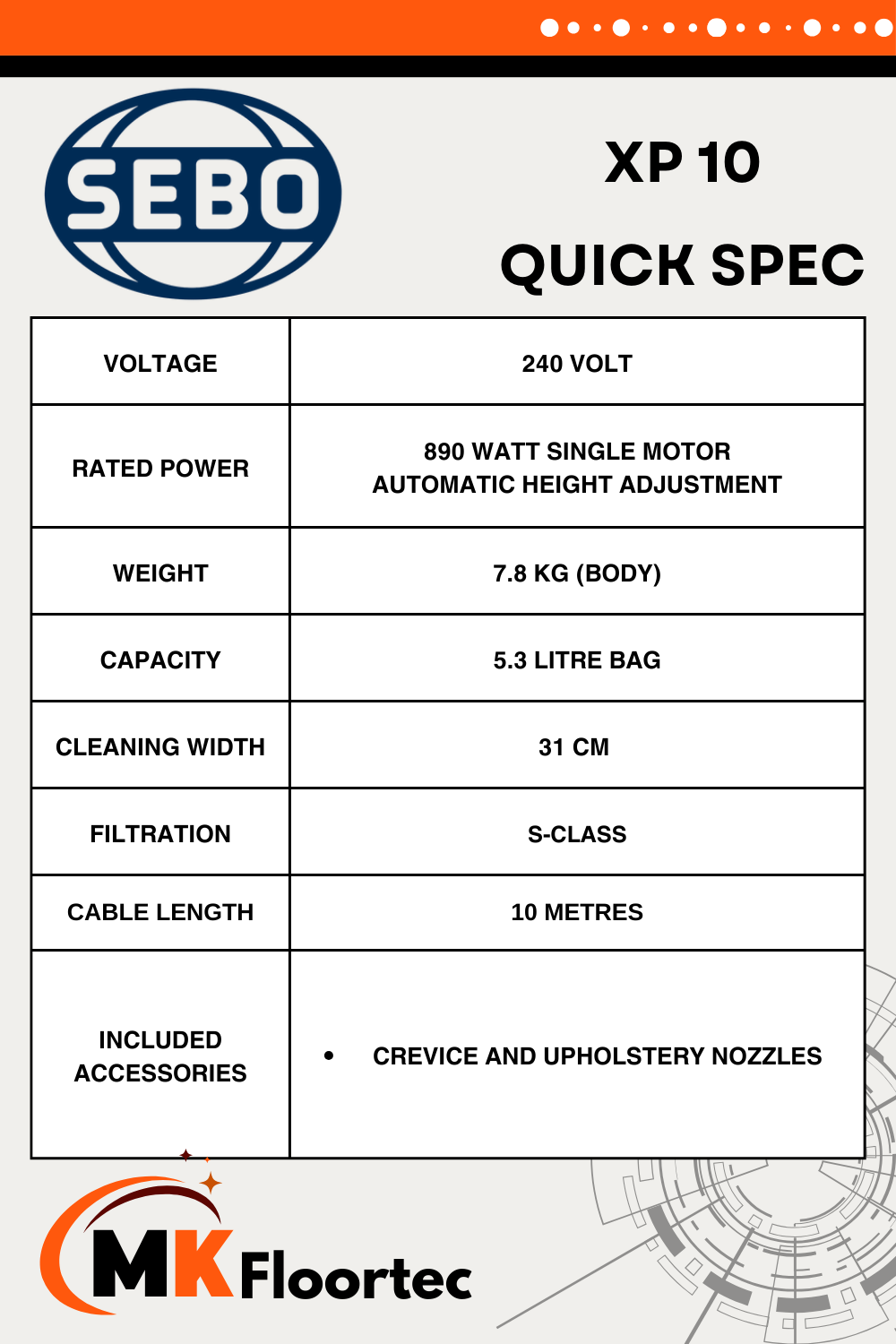 The Sebo XP10 shares many characteristics with the X7 White and Onyx models. The graphic below illustrates the similarities among these models.