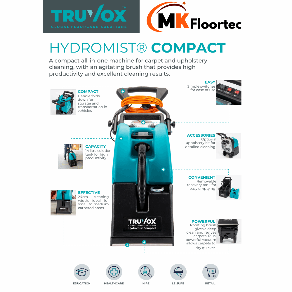 The Truvox HYDROMIST COMPACT HC250. This compact, all-in-one machine is designed for cleaning carpets and upholstery. Very popular in the care and education sectors.