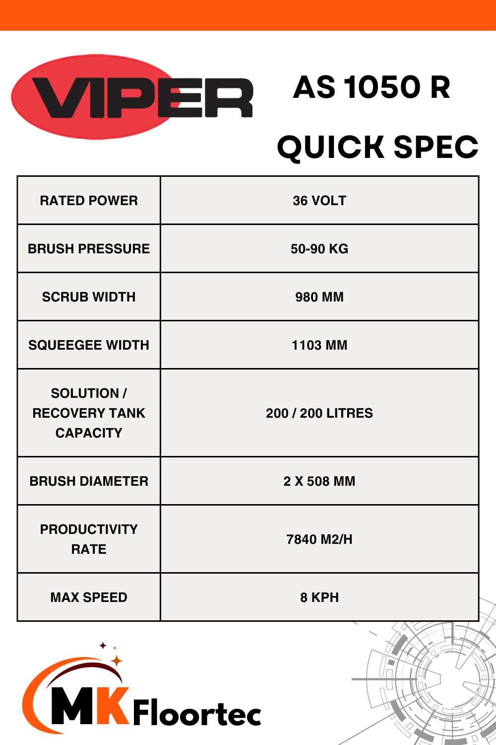 In essence, the Viper AS1050R is engineered to tackle extensive floor spaces, achieving an outstanding productivity rate of nearly 8000 m²/h. However, don't be misled into thinking it's a bulky machine; this thoughtfully designed cleaner is compact and highly manoeuvrable.